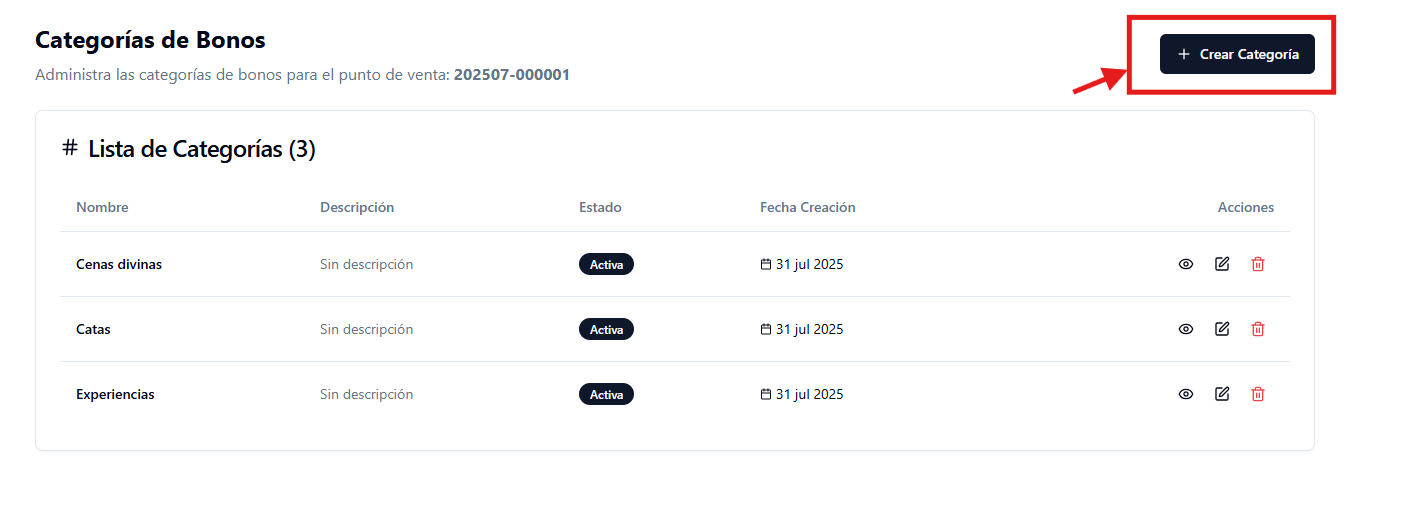Categoría. Elegimos una de las categorías creadas para organizar nuestros bonos, por ejemplo pueden ser cenas, comidas, catas...