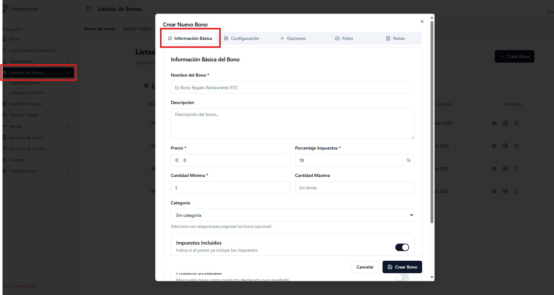 Después, iremos a Catálogo de Bonos – Crear Bono y comenzaremos con la configuración del mismo.