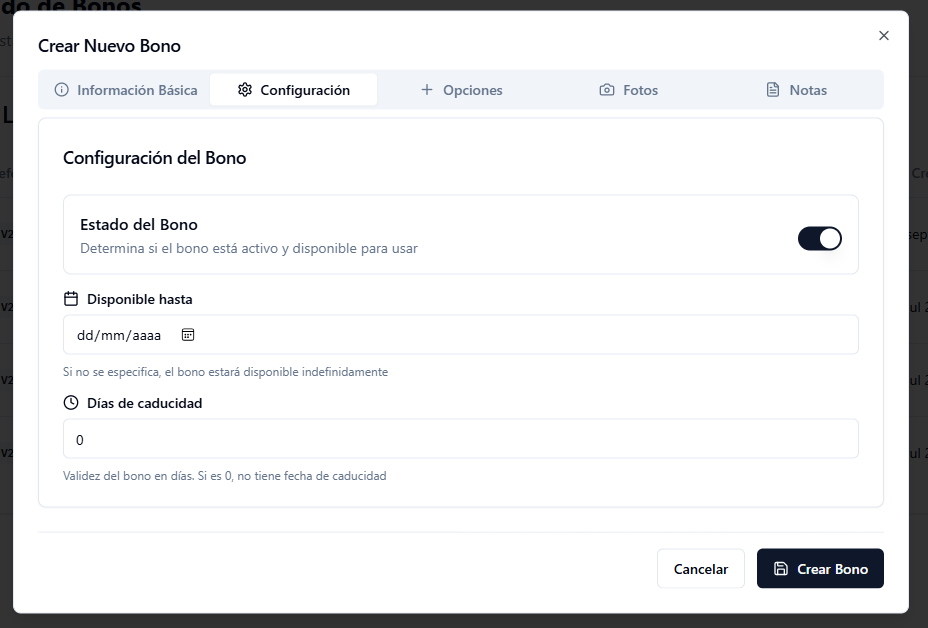 - Días de caducidad: si marcamos 0 el bono no caduca