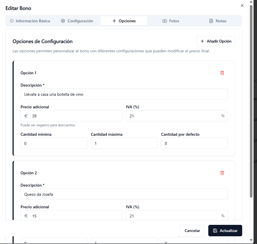 Podemos crear productos complementarios que pueden asociarse a la venta de un bono. Por ejemplo, junto con un bono de una cena podemos vender una botella, un pan especial, un queso...
