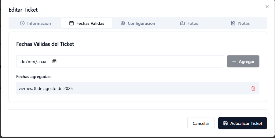 Las fechas válidas también serán diferentes en la creación de tickets.