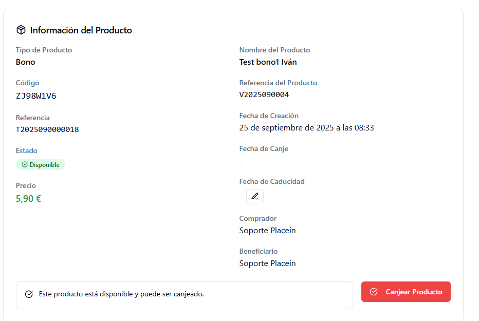 - Información del producto. Tipo de producto, código, referencia, estado del producto, precio, nombre del producto, fecha de creación, fecha del canje y de la caducidad, comprador y beneficiario